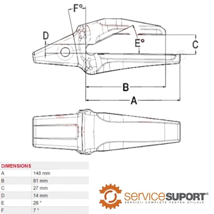 Cu o greutate de 3.80 kg și dimensiuni precise – A=148 mm, B=81 mm, C=27 mm, D=14 mm, E=28°, F=7° – adaptorul 1193253 Caterpillar M316C este construit din oțel rezistent la uzură, conceput să suporte solicitările intense din șantiere și lucrări grele.