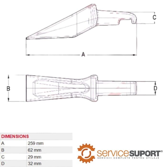 Cu o greutate de 2.50 Kg și dimensiuni optimizate (A = 259.00 mm, B = 62.00 mm, C = 29.00 mm, D = 32.00 mm), DINTE CUPĂ 4046815 EXCAVATOARE este fabricat din oțel rezistent la uzură, pentru a oferi protecție îndelungată cupei utilajului.
