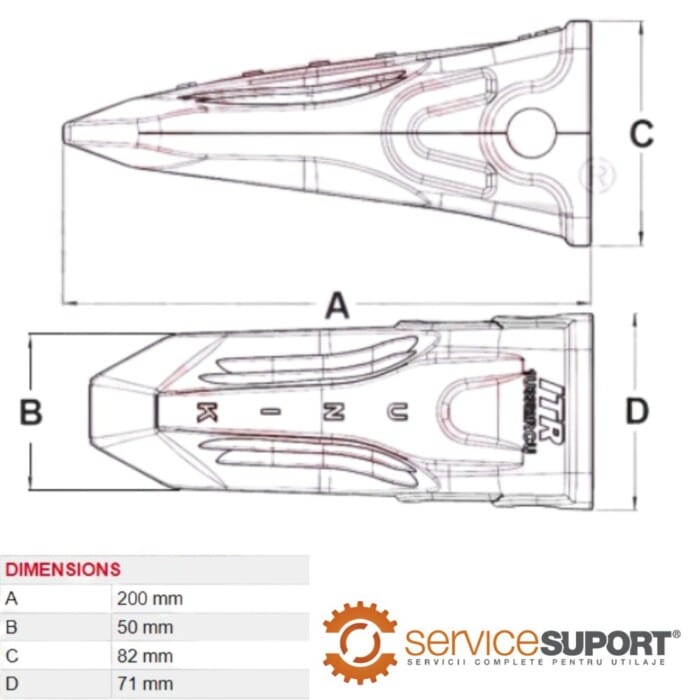 DINTE CUPĂ 6Y3222RCU CATERPILLAR 307, produs de ITR Italia, este proiectat pentru performanță superioară în condiții dificile de lucru. Fabricat din oțel cu duritate de 500 Brinell, acest dinte de cupă asigură o rezistență crescută la uzură și are o durată de viață de până la trei ori mai lungă față de dinții standard. Cu o greutate de 2.66 kg și dimensiuni precise (A=200 mm, B=50 mm, C=82 mm, D=71 mm – vezi desenul tehnic mai jos), poate fi comandat cu sau fără siguranță, în funcție de sistemul de prindere al cupei dumneavoastră.