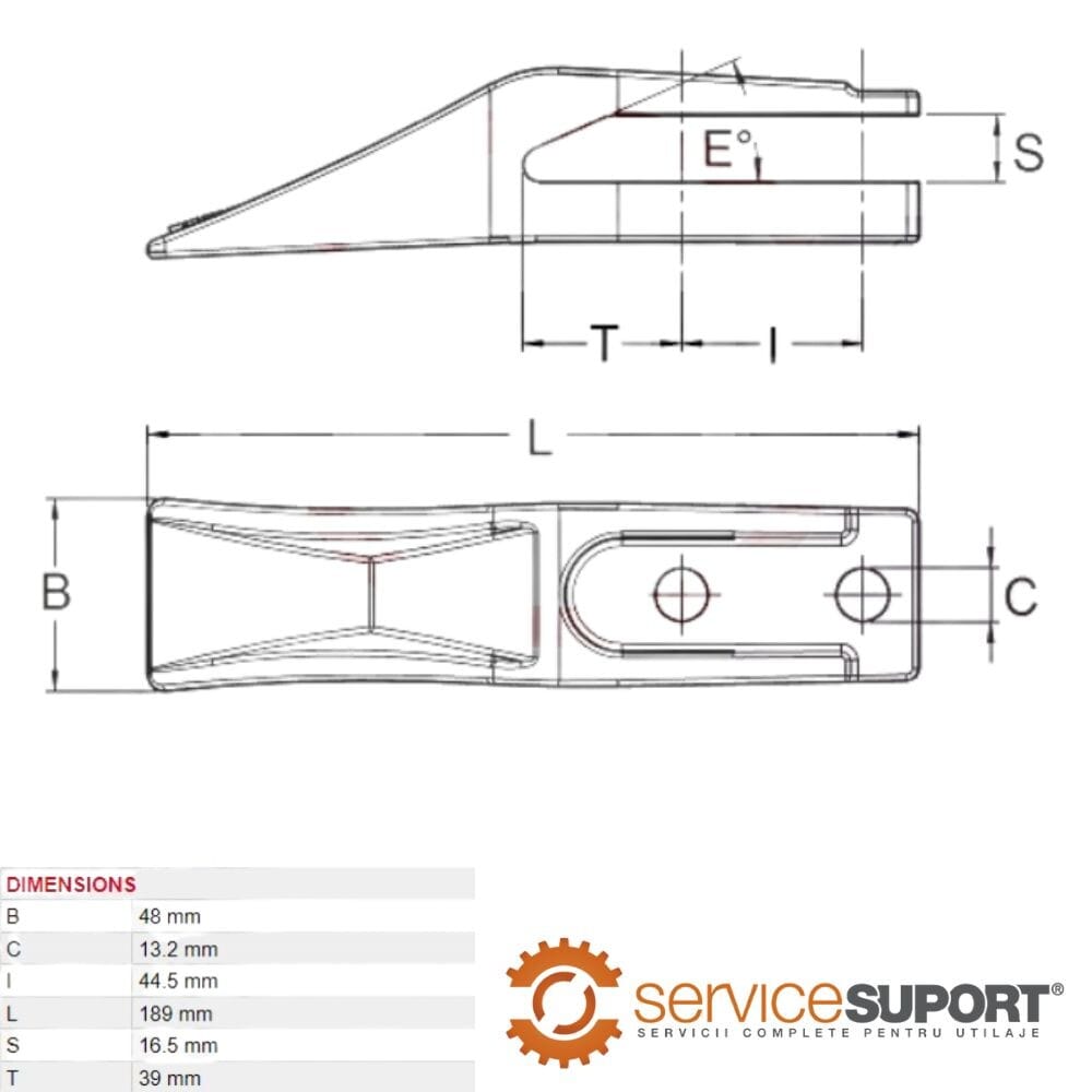 Cu o greutate de 1.47 kg și dimensiuni optimizate (L = 190 mm, B = 48 mm, C = 13.20 mm, I = 44.50 mm, S = 16.50 mm), DINTE CUPĂ UE190H37DU JCB 8025 este fabricat dintr-un oțel special, rezistent la uzură, ideal pentru condiții dificile de operare. Se poate comanda cu sau fără șuruburi și piulițe, în funcție de necesitățile clientului.