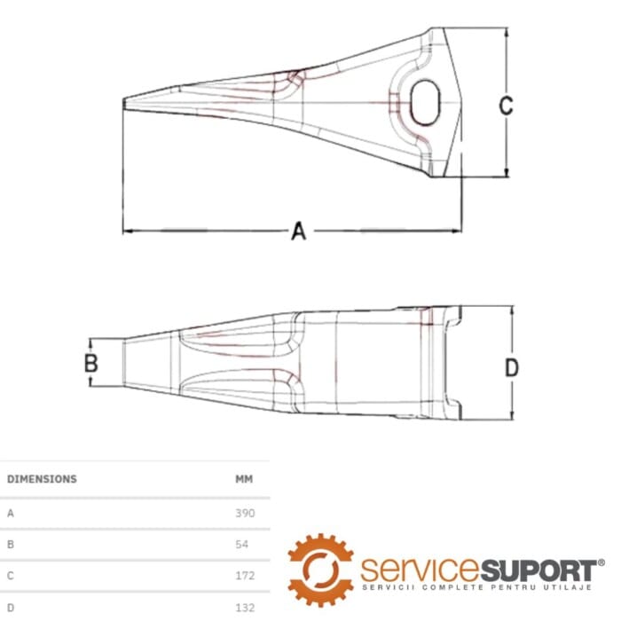 Cu dimensiuni A: 390 mm, B: 54 mm, C: 172 mm, D: 132 mm și o greutate de 16.86 kg, DINTE SCARIFICATOR 4T5452 CATERPILLAR 325 oferă rezistență superioară la uzură și performanță constantă pe teren dificil. Schimbarea dinților uzati cu acest model contribuie la distribuția uniformă a forțelor și protecția componentelor utilajului.